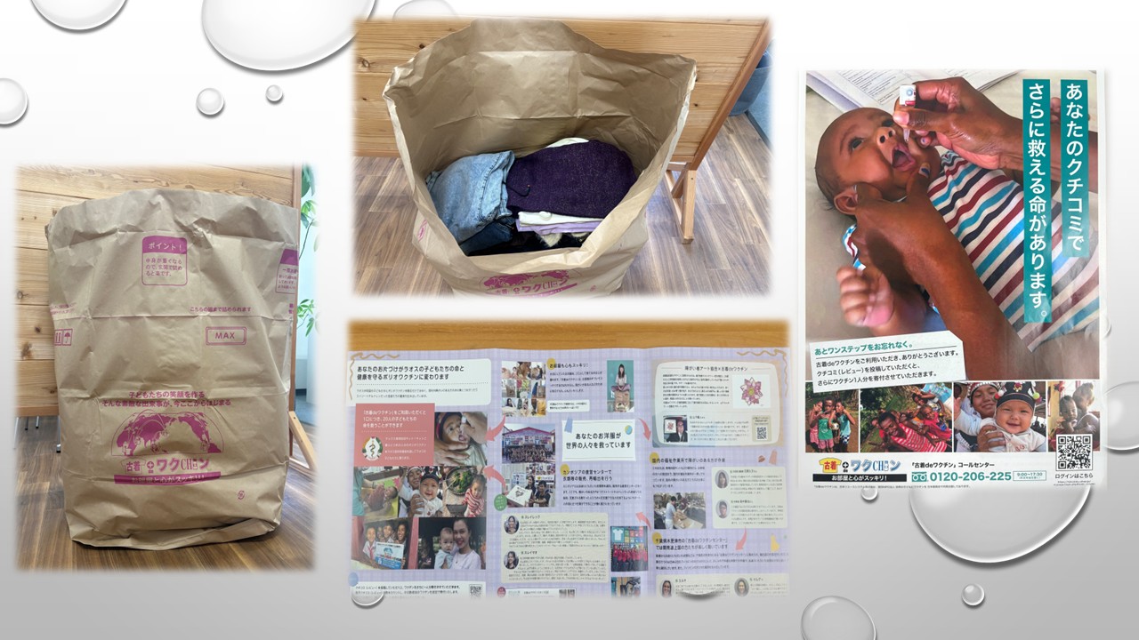 この取り組みは「古着deワクチン」(HP https://furugidevaccine.etsl.jp/about/)で専用回収キットを購入し、不要な衣類などを送ることでラオスの子どもたちの命と健康を守るポリオワクチンが贈られます。